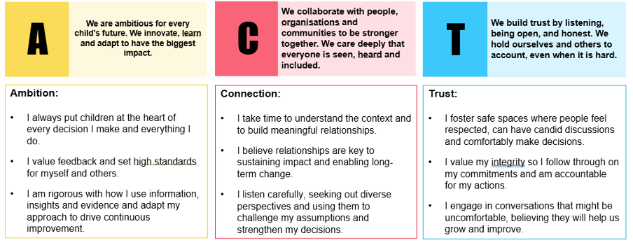 Our values guide how we work, how we show up for children, and how we partner with others. They reflect who we are, what we stand for, and the standards we hold ourselves to every day. Rooted in ambition, shaped by connection, and strengthened by trust, these values drive our decisions and our impact.